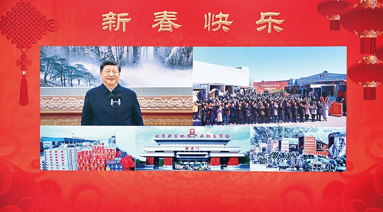 2023年1月18日,中共中央總書記、國(guó)家主席、中央軍委主席習(xí)近平在北京通過(guò)視頻連線看望慰問(wèn)基層干部群眾,向全國(guó)各族人民致以新春的美好祝福。這是習(xí)近平通過(guò)視頻連線,同北京新發(fā)地農(nóng)產(chǎn)品批發(fā)市場(chǎng)的商戶和采購(gòu)年貨的群眾親切交流。新華社記者 李濤/攝