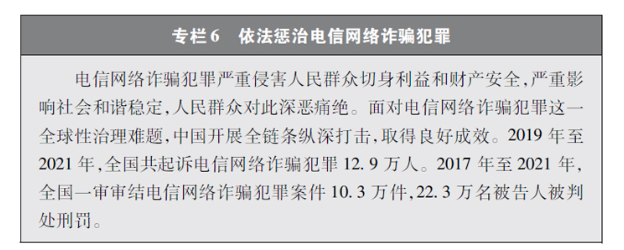 加大網(wǎng)絡(luò)犯罪懲治力度。隨著互聯(lián)網(wǎng)技術(shù)的快速發(fā)展,傳統(tǒng)犯罪加速向以互聯(lián)網(wǎng)為媒介的非接觸式犯罪轉(zhuǎn)變,電信網(wǎng)絡(luò)詐騙、網(wǎng)絡(luò)賭博、網(wǎng)絡(luò)淫穢色情等涉網(wǎng)違法犯罪多發(fā)。中國(guó)依法辦理新型網(wǎng)絡(luò)犯罪案件。連續(xù)多年開展“凈網(wǎng)行動(dòng)”,嚴(yán)厲打擊群眾反映強(qiáng)烈的黑客攻擊破壞、侵犯公民個(gè)人信息等違法犯罪活動(dòng)。持續(xù)推進(jìn)“云劍”“斷卡”“斷流”“拔釘”等專項(xiàng)行動(dòng),打擊套路貸、校園貸、“以房養(yǎng)老”、“投資養(yǎng)老”等電信網(wǎng)絡(luò)詐騙犯罪,依法懲處為電信網(wǎng)絡(luò)詐騙犯罪團(tuán)伙提供互聯(lián)網(wǎng)接入、域名注冊(cè)、服務(wù)器托管、移動(dòng)互聯(lián)網(wǎng)應(yīng)用程序制作開發(fā)、網(wǎng)絡(luò)支付、引流推廣等服務(wù)支撐的黑灰產(chǎn)業(yè)。完善國(guó)家反詐大數(shù)據(jù)平臺(tái)和反詐移動(dòng)互聯(lián)網(wǎng)應(yīng)用程序,建設(shè)國(guó)家涉詐黑樣本庫(kù),完善快速止付凍結(jié)機(jī)制、涉詐資金返還機(jī)制。堅(jiān)決打擊網(wǎng)絡(luò)賭博犯罪行為,從嚴(yán)治理網(wǎng)絡(luò)淫穢色情。網(wǎng)絡(luò)犯罪治理工作取得明顯成效,人民群眾安全感有效提升,社會(huì)更加和諧穩(wěn)定。