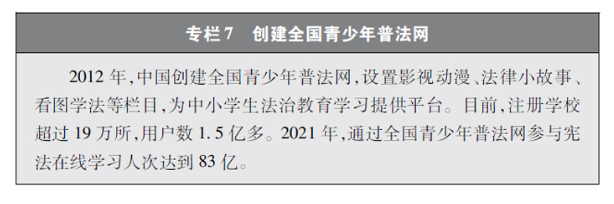 加強(qiáng)青少年網(wǎng)絡(luò)法治宣傳教育。青少年是祖國(guó)的未來、民族的希望。青少年網(wǎng)民在中國(guó)網(wǎng)民中的占比逐步增長(zhǎng)。作為互聯(lián)網(wǎng)的“原住民”,青少年是網(wǎng)上學(xué)習(xí)、交流、生活最活躍的參與者、實(shí)踐者,其合法權(quán)益也更易受到網(wǎng)絡(luò)違法活動(dòng)的侵害。中國(guó)從保護(hù)青少年網(wǎng)絡(luò)權(quán)益,促進(jìn)青少年健康成長(zhǎng)、全面發(fā)展出發(fā),遵循青少年身心發(fā)展規(guī)律,貼近青少年學(xué)習(xí)生活實(shí)際,聚焦網(wǎng)絡(luò)沉迷、網(wǎng)絡(luò)欺凌、網(wǎng)絡(luò)淫穢色情信息等重點(diǎn)問題,通過普法微綜藝、兒童普法話劇、網(wǎng)絡(luò)普法故事廣播、網(wǎng)絡(luò)普法云課堂、學(xué)法用法知識(shí)競(jìng)賽、法治副校長(zhǎng)進(jìn)校園、編寫網(wǎng)絡(luò)普法讀本等生動(dòng)活潑、豐富多彩的形式開展法治宣傳教育,逐步形成了政府、社會(huì)、學(xué)校、家庭相結(jié)合的法治宣傳教育格局,為提升青少年網(wǎng)民法治意識(shí)和網(wǎng)絡(luò)安全素養(yǎng)提供了全面保障。