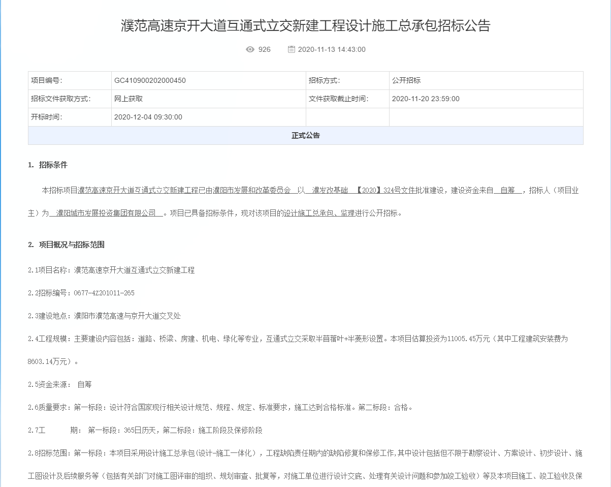 濮范高速京開大道互通式立交新建工程項目掛網(wǎng)發(fā)布
